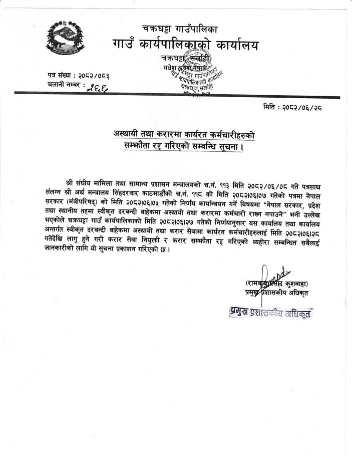 अस्थायी तथा करारमा कार्यरत कमर्चारीहरुको सम्फौता रद गरिएको सम्बन्धि सूचना ।