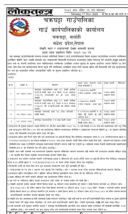 पोखरी-सटर र बजारको ठेक्का सम्बन्धी सूचना
