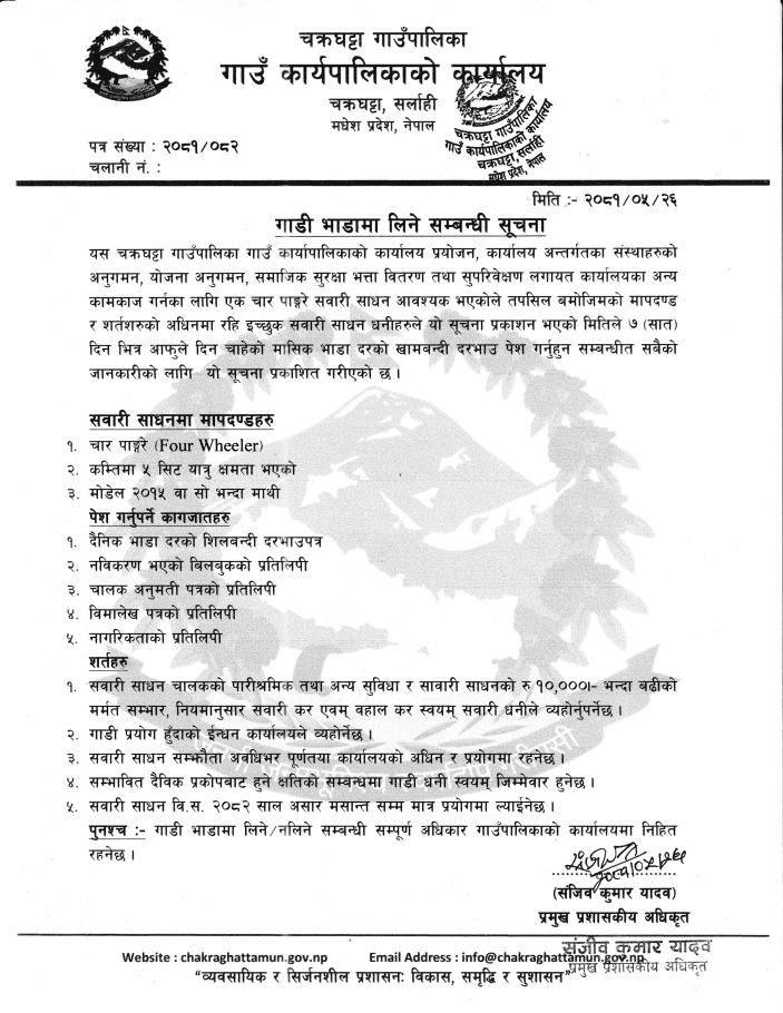गाडी भाडामा लिने सम्बन्धी सूचना